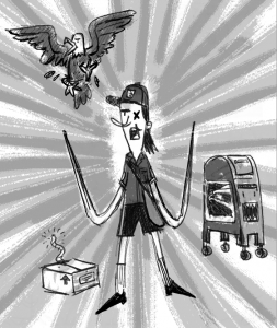 Meet new villain “The Carrier” and his sidekicks of doom going Postal. For @littlenono: “a post office employee themed villain. a bad guy who specializes in destroying you in post-related ways only.” (those are letter opener hands)