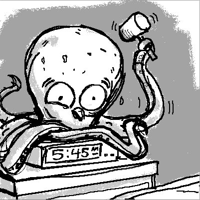 For @sketchbob: “Every morning, the overwhelming sense of dread hit him 15 mins. before the alarm.”