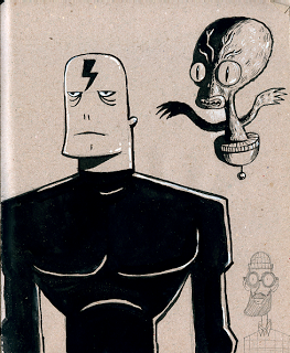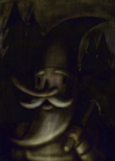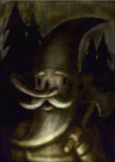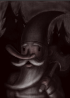 HUGE Thanks to Jon for sending some Monoprint Photoshop brush textures he found. This actually is a tremendous help towards getting a more realistic texture. I created this bg with the brushes, copied it into the gnome file and then used the Difference filter at an opacity of 60%. The result is kinda spooky… Then I tweaked the contrast/brightness of the original image and added some more highlights back in.